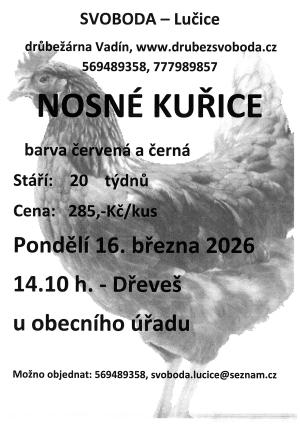 Firma Svoboda Lučice pořádá prodej nosných kuřic, které se uskuteční v pondělí 16. března 2026 v 14:10 hodin u Obecního úřadu ve Dřeveši. Nabídka zahrnuje kuřice stáří 20 týdnů v barvách červená-Isa brown a černá-Morávia. Cena za kus činí 285 Kč.