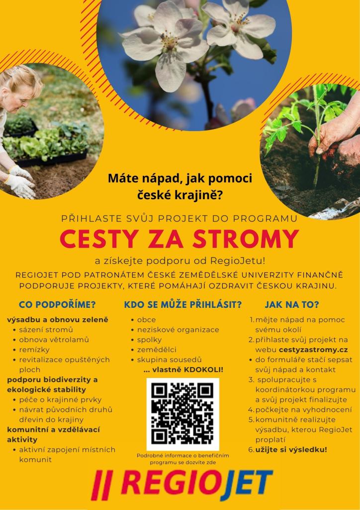 RegioJet, pod patronátem České zemědělské univerzity, zahájil program Cesty za stromy, který má za cíl podpořit projekty zaměřené na ozdravení české krajiny. Tento program financuje různé aktivity, jako je sázení stromů, obnova větrolamů, revitalizace opuštěných ploch a podpora biodiverzity.