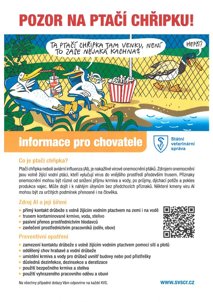 Aktuální informace o ohniscích ptačí chřipky v České republice i v zahraničí naleznete na webových stránkách Státní veterinární správy Ptačí chřipka – aviární influenza – Státní veterinární správa.