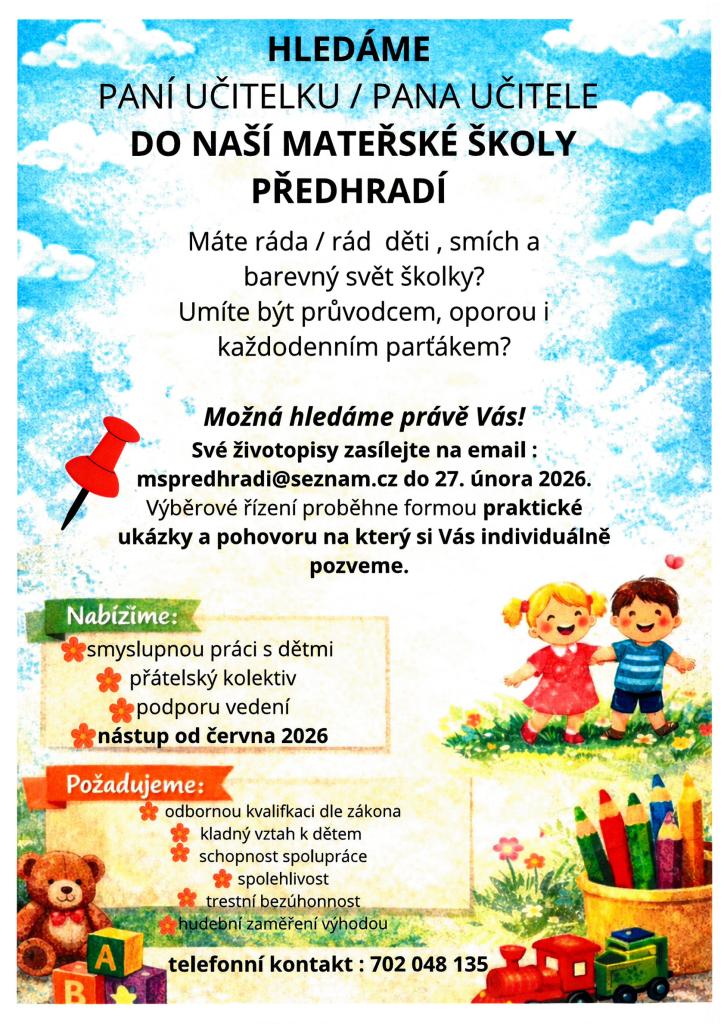 Mateřská škola Předhradí hledá paní učitelku či pana učitele.