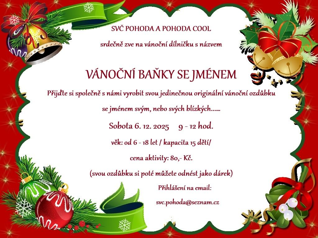 Přijďte si společně s námi vyrobit svou jedinečnou originální vánoční ozdůbku se jménem svým nebo svých blízkých. Akce je určena pro mladé lidi ve věku od 6 do 18 let a kapacita je omezena na 15 účastníků. Cena aktivity činí 80 Kč. Po vytvoření si ozdůbku můžete odnést jako dárek.