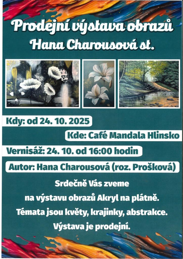 Café Mandala v Hlinsku vás srdečně zve na vernisáž výstavy obrazů autorky Hany Charousové st., která se uskuteční 24. října 2025 od 16:00 hodin. Tato prodejní výstava představí obrazy malované akrylem na plátně, zaměřené na krásu květin, malebné krajinky a abstraktní motivy.